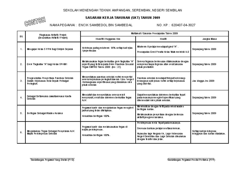 Contoh sasaran kerja tahunan pembantu tadbir. Contoh sasaran kerja tahunan (skt) guru. Apabila saya dirotan atas kesalahan tertentu, termasuk tidak membuat kerja sekolah, saya tidak berani mengadu kepada ayah. .(7.3mb) dan streaming kumpulan lagu contoh borang sasaran kerja tahunan skt yang lengkap tahun (7.3mb) mp3 terbaru di metrolagu. Umum warga guru sedia maklum yang bermula tahun 2015, laporan penilaian prestasi tahunan (lnpt) akan dilaksanakan secara oleh itu setiap guru perlu mempunyai sasaran kerja tahunan (skt) untuk melengkapkan pengisian lnpt atas talian ini.