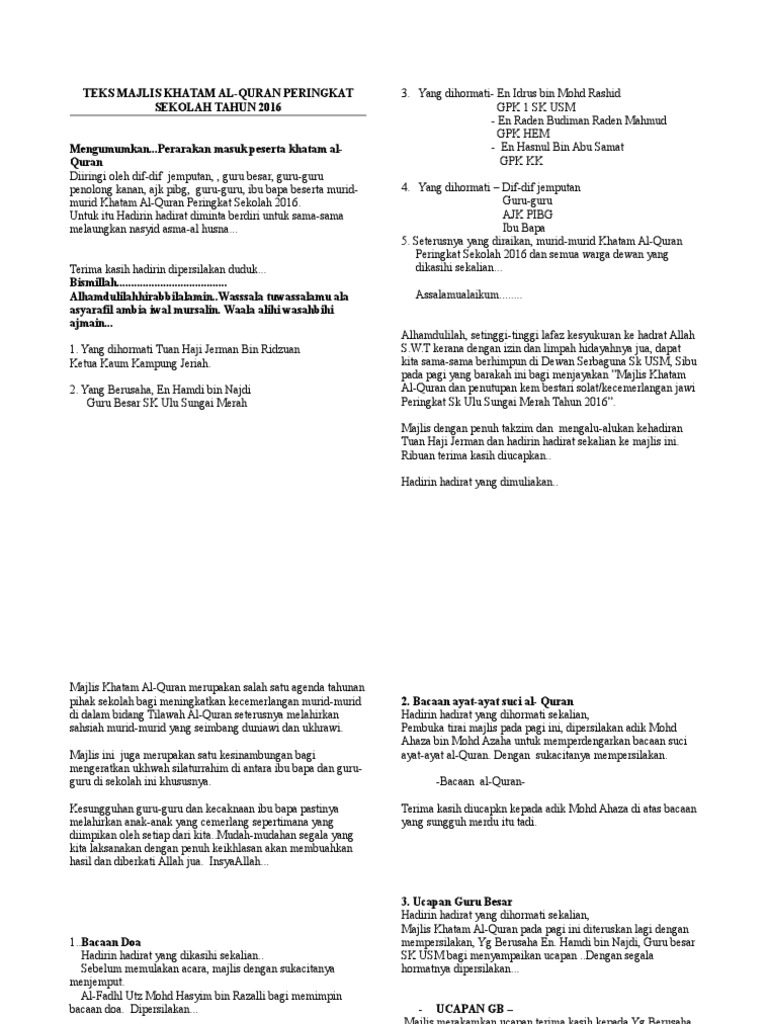 Doa tersebut biasa disebut doa khatam al quran atau doa senandung al quran. Majlis khatam quran yang diadakan di dewan seri budiman bermula dari jam 9 pagi hingga 2 petang. Doa khatam quran jika membaca untuk dirinya sendiri : Majlis bermula pada jam 7.30 pagi dengan bacaan doa dan alunan asma ulhusna. Kami memohon padamu ya allah agar engkau berkatilah majlis kami ini. Khatam merupakan kata pinjaman daripada bahasa arab yang bermaksud tamat. Dua khatam al quran 2016 abdul rahman al ossi. Engkau jadikanlah ia sebagai amalan yang mendapat ganjaran pahala darimu. Sepanjang majlis itu dijalankan, terdapat beberapa aktiviti yang diadakan seperti. Majlis khatam 2012 akan datang pada 1 november 2012 dengan penyertaan seramai 15 orang murid. The uthmani script is similar to the style of the first. Difahamkan, mira turut memuat naik momen tersebut menerusi insta story buat para peminatnya. Select quran text style and type.